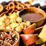 Building this snack board is all about balance and having different choices. Sliced apples with a sweet caramel sauce taste superb together. It’s a classic mix that people like. The orange-white chocolate is bright and creamy, working well with crunchy pretzels and nuts.
